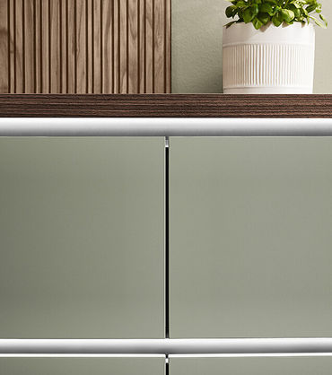 This bright, inviting and friendly ambience is the perfect place to share special moments. Clear lines combine with the soft sand colour to create a relaxed atmosphere and modern cottage style flair, which makes family and friends feel right at home. With a focus on maximum cosiness, the elongated wall board not only offers space for everything that’s important to you, but also adds a touch of personality to your kitchen. The glass elements with framed glass doors ensure lightness and the typical Scandinavian look, whilst the interior unit lighting creates just the right mood. Perfect for any occasion.