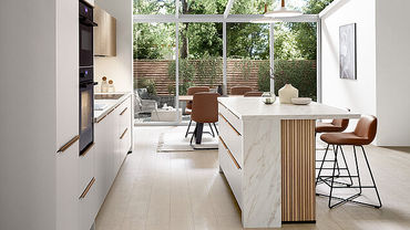 everything. Designed with an eye for detail, the Carrara bronze marble look worktop pairs beautifully with the sink, tap and recessed handle in bronze – especially in a bright atmosphere.