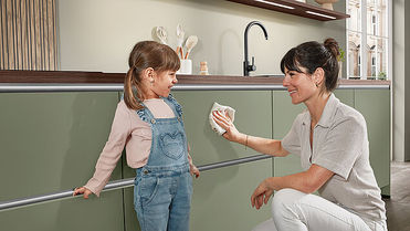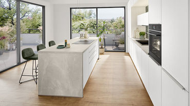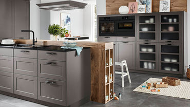Life happens in open and spacious kitchens, where people pursue their love of cooking every day. With space for everyone and everything, the kitchen island in wood-look Sierra oak is a true natural beauty and the central location for cooking together, chatting and enjoying family life. The combination of natural-looking wood elements and bright décor in satin grey ensures the perfect balance of cosiness and modernity. The matt lacquered fronts with innovative anti-fingerprint coating
