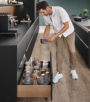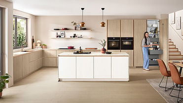 A kitchen perfectly tailored to Sally’s style, with spacious work surfaces, functionality, organisation and easy-care surfaces featuring an anti-fingerprint coating, all of which are must-haves for Germany’s most prominent food blogger. For Sally, the kitchen also serves as a workspace, a family space and a source of inspiration. Like the white kitchen island, the continuous tall units in Como oak offer extra storage space, with perfectly organised drawers and pull-outs that provide easy access to